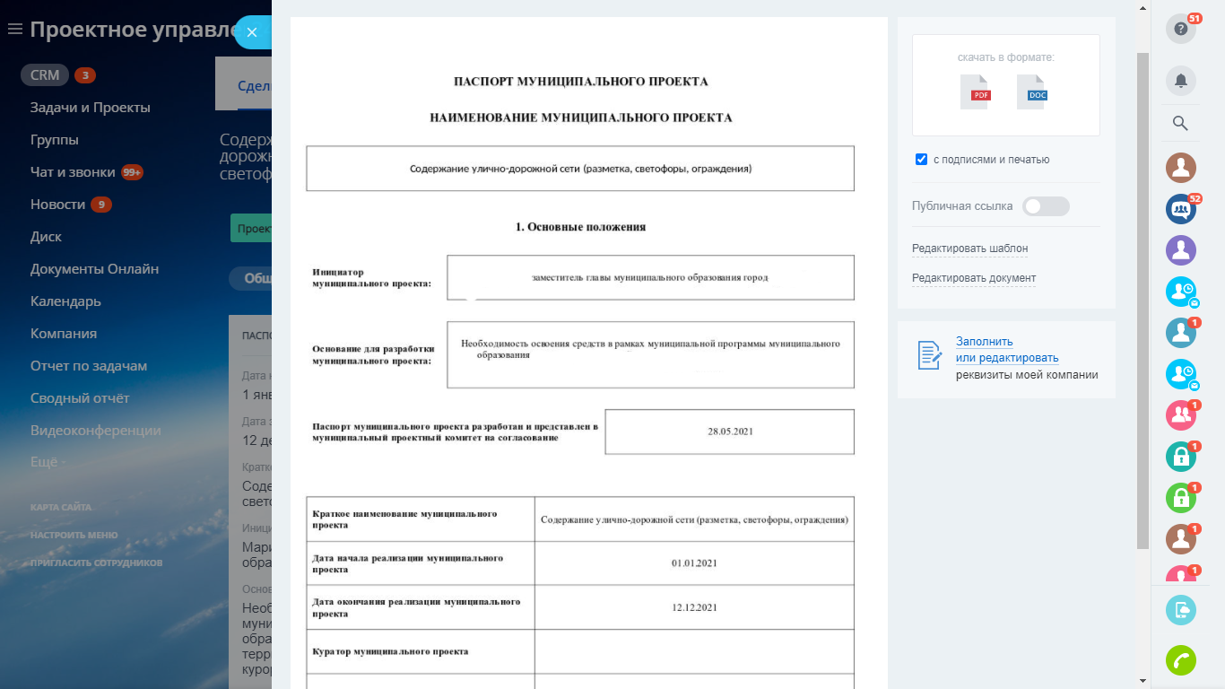 Автоматическое создание паспортов проектов и сводных отчетов.